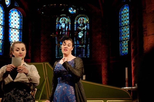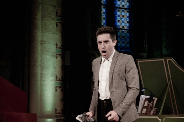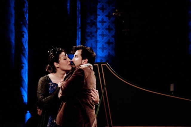 Un spectacle en 2 actes qui, déjà, dure une heure et demie sans la pause. L’effet en a été éloquent : on a annoncé un « orchestre symbolique » aux 2 clavecins réunis, mais c’est à un orchestre de cordes pincées que les gens ont pensé sans cesse dans ce lieu peu fait pour l’opéra : les deux instruments réunis étaient portés et amplifiés par le lieu – une église de 250 places – , et formaient un son riche, plein et spatial, entourant les chanteurs.