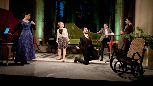 Le talent des cinq chanteurs était tel (pour ce qui est de la voix, de la préparation musicale, de la connaissance du texte et du jeu scénique) – et, il faut le dire, l’expérience remarquable de Carlos Harmuch dans l’art de faire beaucoup avec l’essentiel – que c’était finalement une grande partie de l’oeuvre qui a été présentée sous une forme totalement mise en scène autour de 2 clavecins. On aurait pu croire que ce serait une anthologie, c’était l’oeuvre elle-même – allégée, avec, comme autrefois, où on ne se gênait pas de s’adapter au public, des récitatifs ramenés à l’ essentiel, parfois chantés, mais le plus souvent parlés et joués en français parsemé d’italien. Ce n’est pas le public qui s’en plaindra.