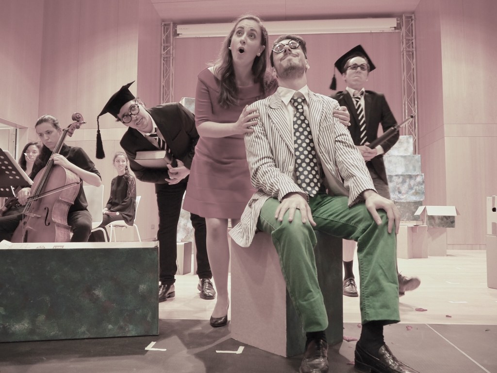 Un livret complètement loufoque fait pour amuser le public avec des sujets porteurs : le thème de l’idée fixe très fréquent chez Paisiello, le conflit de générations, la montée de la bourgeoisie aspirant à la culture, la place des femmes dans la nouvelle société, et le subterfuge inépuisable du déguisement.